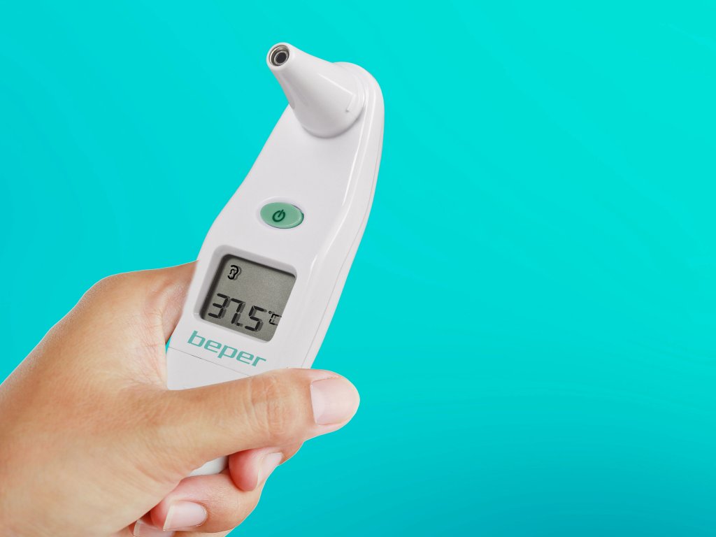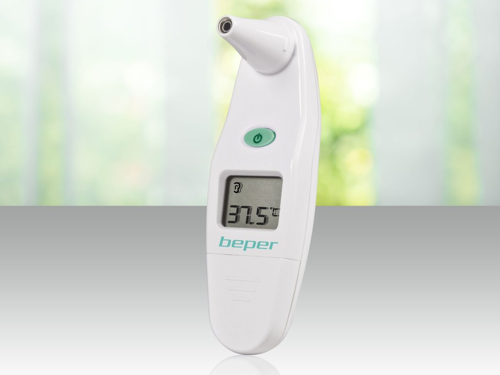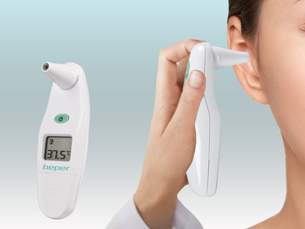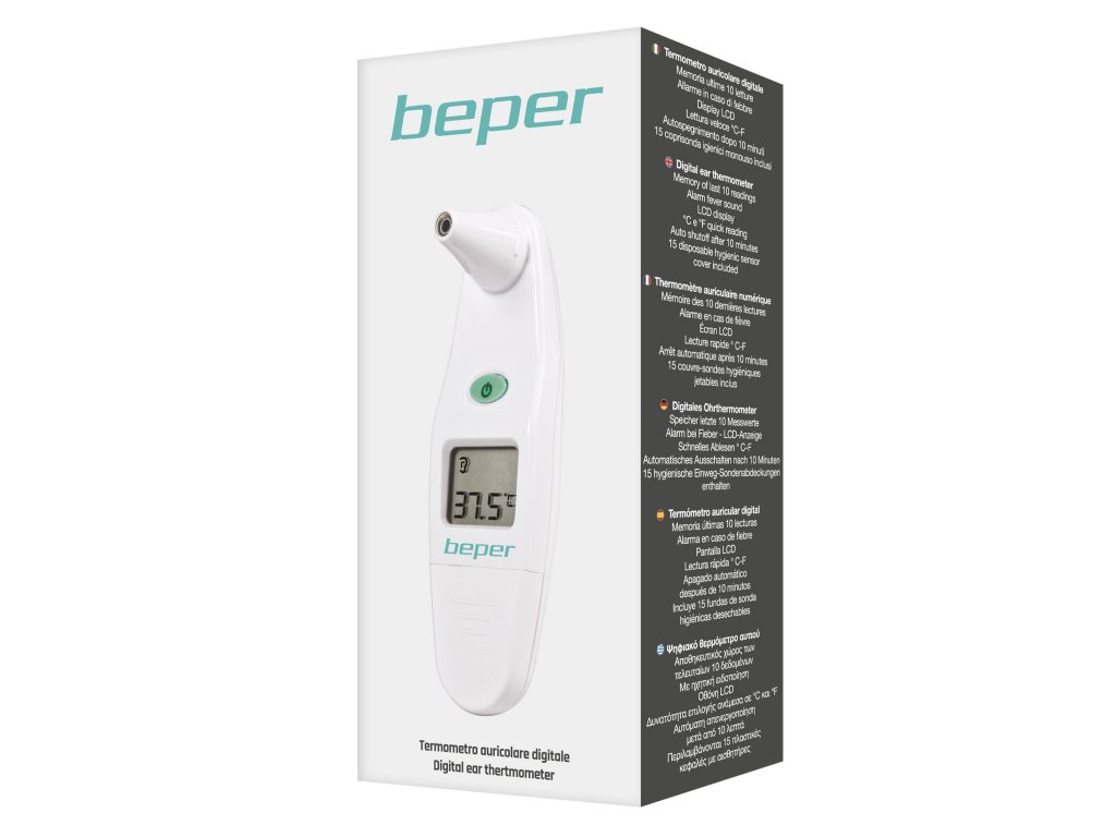 Digitālais termometrs lietošanai ausīs ar infrasarkano tehnoloģiju. Aprīkots ar skaņas signālu, kad tas ir gatavs lietošanai un temperatūrai > 37,8°C. Iespēja izvēlēties starp °C un ºF. Temperatūras diapazons no 32,0°C līdz 43,0°C. Ar šķidro kristālu displeju, 10 datu atmiņām un futrāli. Komplektā ir 15 higiēniski plastmasas sensoru vāciņi un 1 baterija.