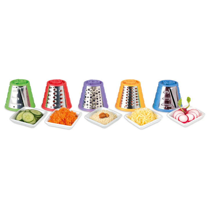 Universāls dārzeņu griezējs ar 5 modeļiem dažādām funkcijām: sagriešana, smalks un rupjš režģis, smalka un rupja griešana