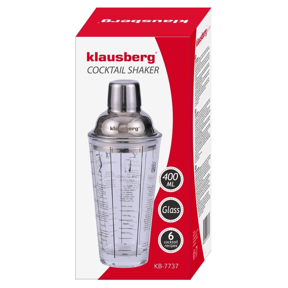 Šeikeris no stikla ar uzdrukātām receptēm, 22,7 × 8,5 × 8,5 cm, Klausberg, KB 7737. Uz šeikera stikla ir uzdrukātas kokteiļu receptes. Komplektā ietilpst mērglāzītes uzgalis un vāks ar sietiņu, kā arī atzīmes uncēs un mililitros, kas ļauj precīzi nomērīt sastāvdaļas un pagatavot skaistus kokteiļus no sākuma līdz beigām. Kokteiļu šeikeri ir būtiski mājas bāram, tāpēc tie ir lieliska dāvana mājokļa iesvētībās, kāzās vai īpašos svētkos. Uzdrukātās receptes palīdz iesācējiem bārmeņiem apgūt klasiskos kokteiļus. Viegli lietojams. Viegli kopjams. Izmērs: 22,7 × 8,5 × 8,5 cm.