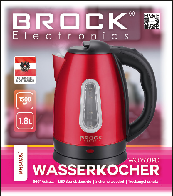 Tilpums: 1,8 l Nerūsējošā tērauda korpuss Ūdens līmeņa indikators Sarkans darbības indikators Trīskārtīga aizsardzība: Aizsardzība pret pārkaršanu, ja ieslēgts bez ūdens Automātiska atslēgšanās, ja noņemts no pamatnes Automātiska atslēgšanās, ja sasniegta vārīšanās temperatūra Sunlight savienojums Strāvas vada garums: 0,75m Jauda: 1500 W