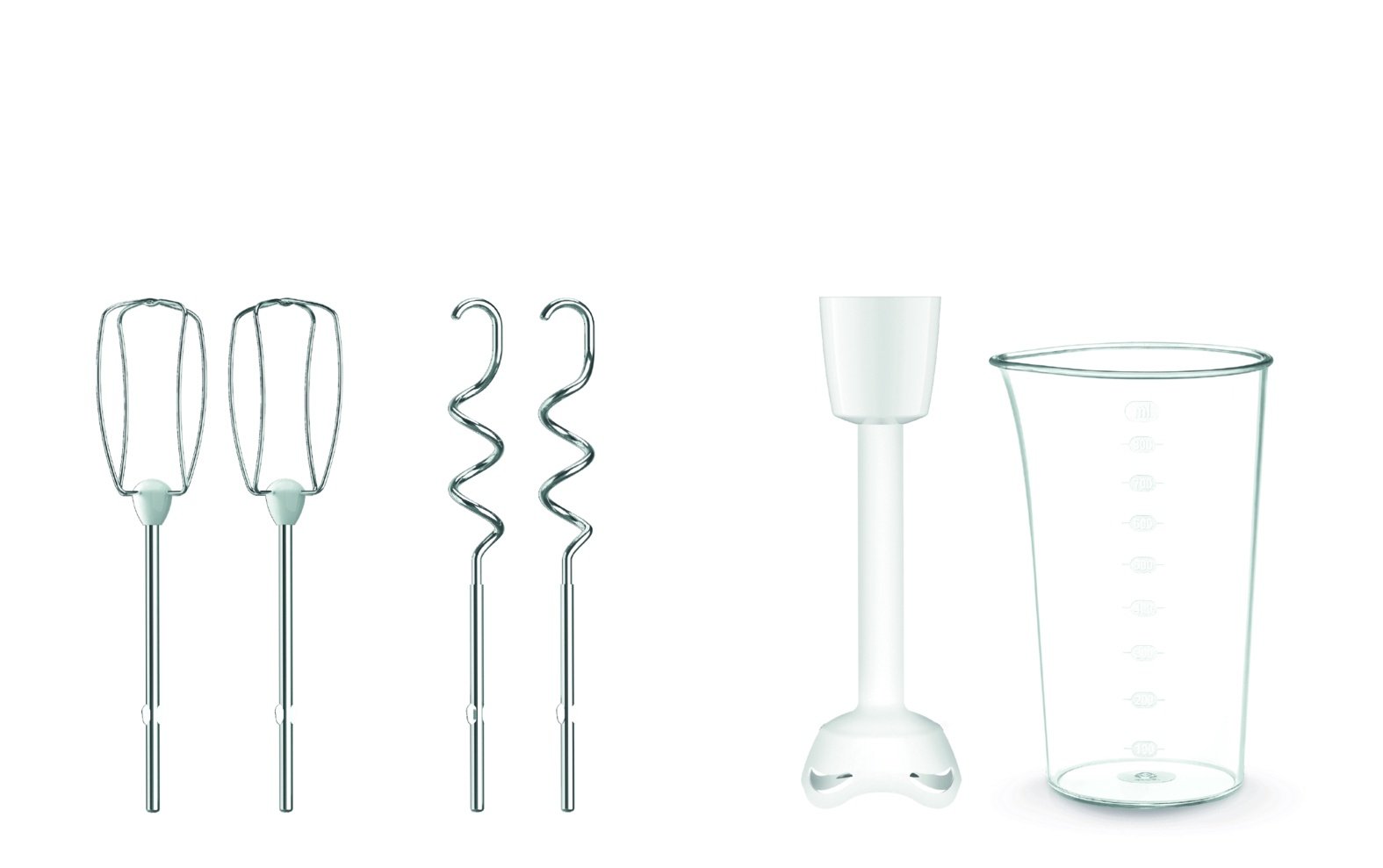 2 putojamās slotiņas, 2 mīklas āķi, rokas blendera piederums, mērglāze 0,8L, plastmasas rokas blendera kāts