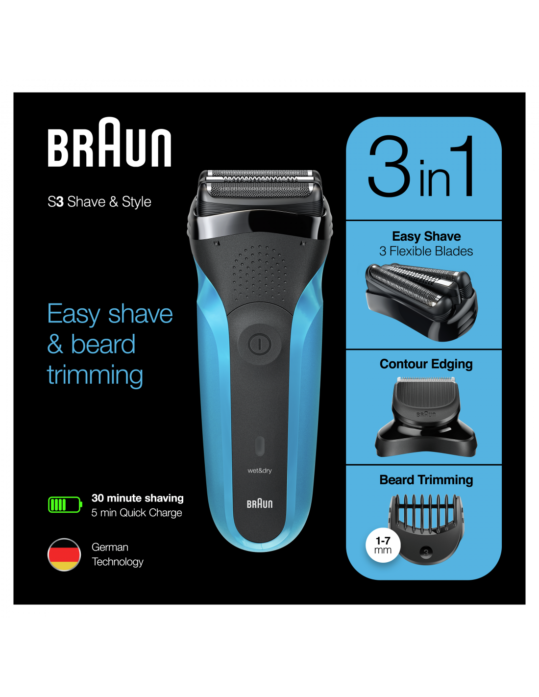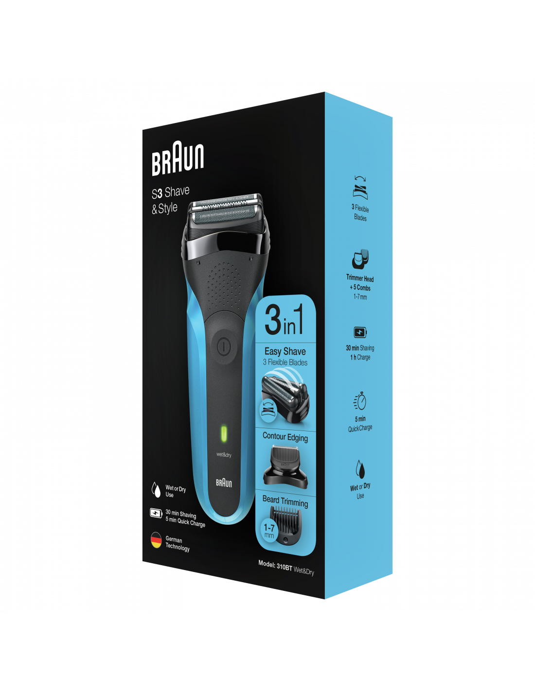 Braun Series 3 Shave&Style 310BT — „Wet & Dry” skuveklis trīs vienā ar precīzu trimmeri un piecām ķemmēm