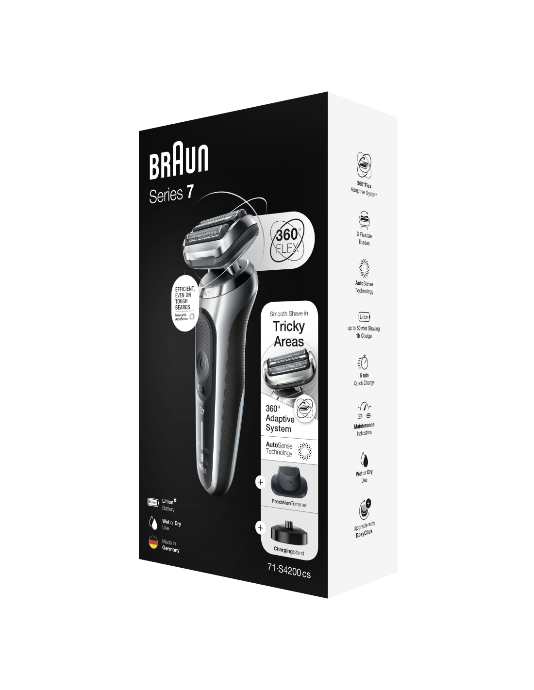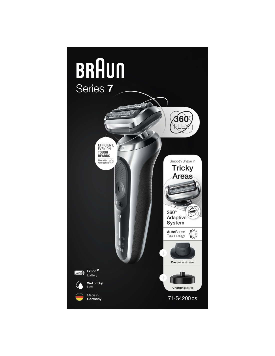 “Braun” 7. sērijas 7-S4200cs elektriskais skuveklis ar uzlādēšanas statīvu, precīzs trimmeris, sausai un slapjai skūšanai, uzlādējams, bezvadu skuveklis ar sietiņu, sudraba krāsā