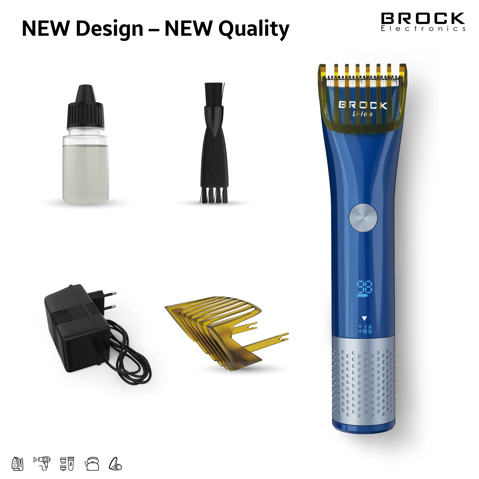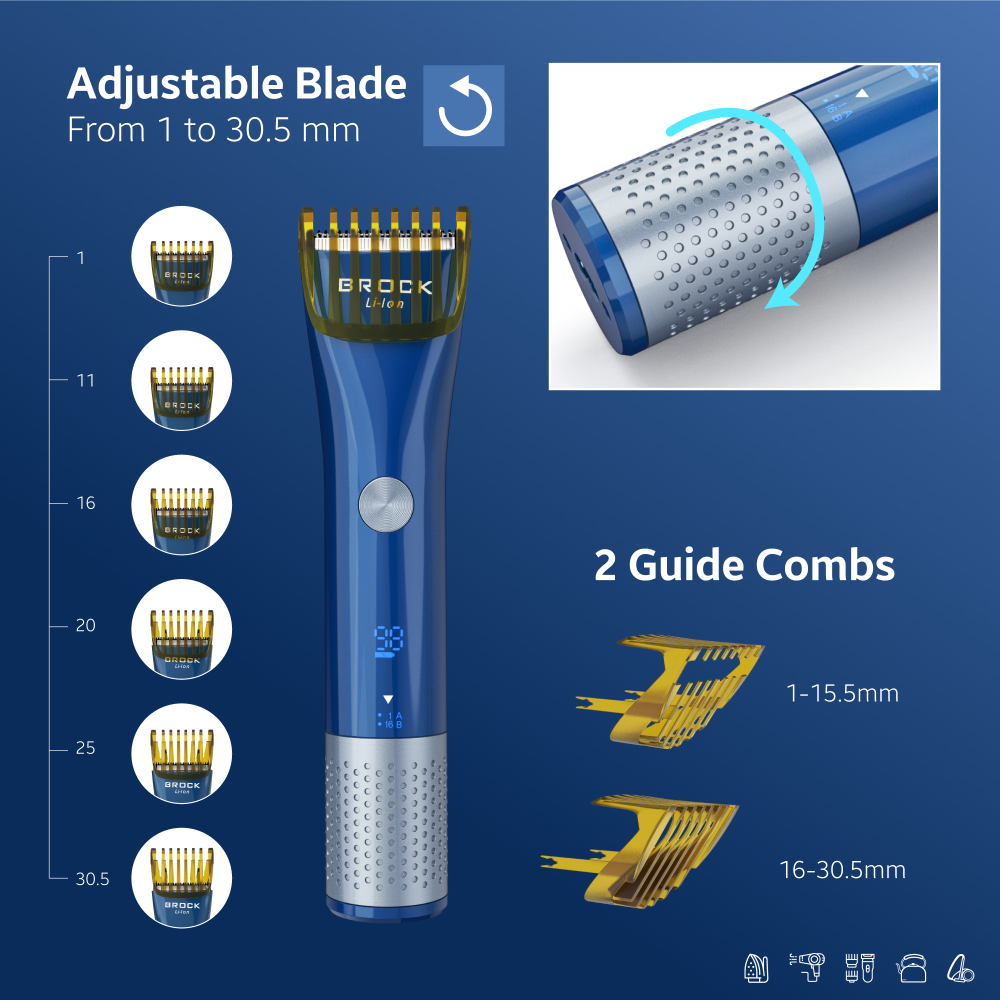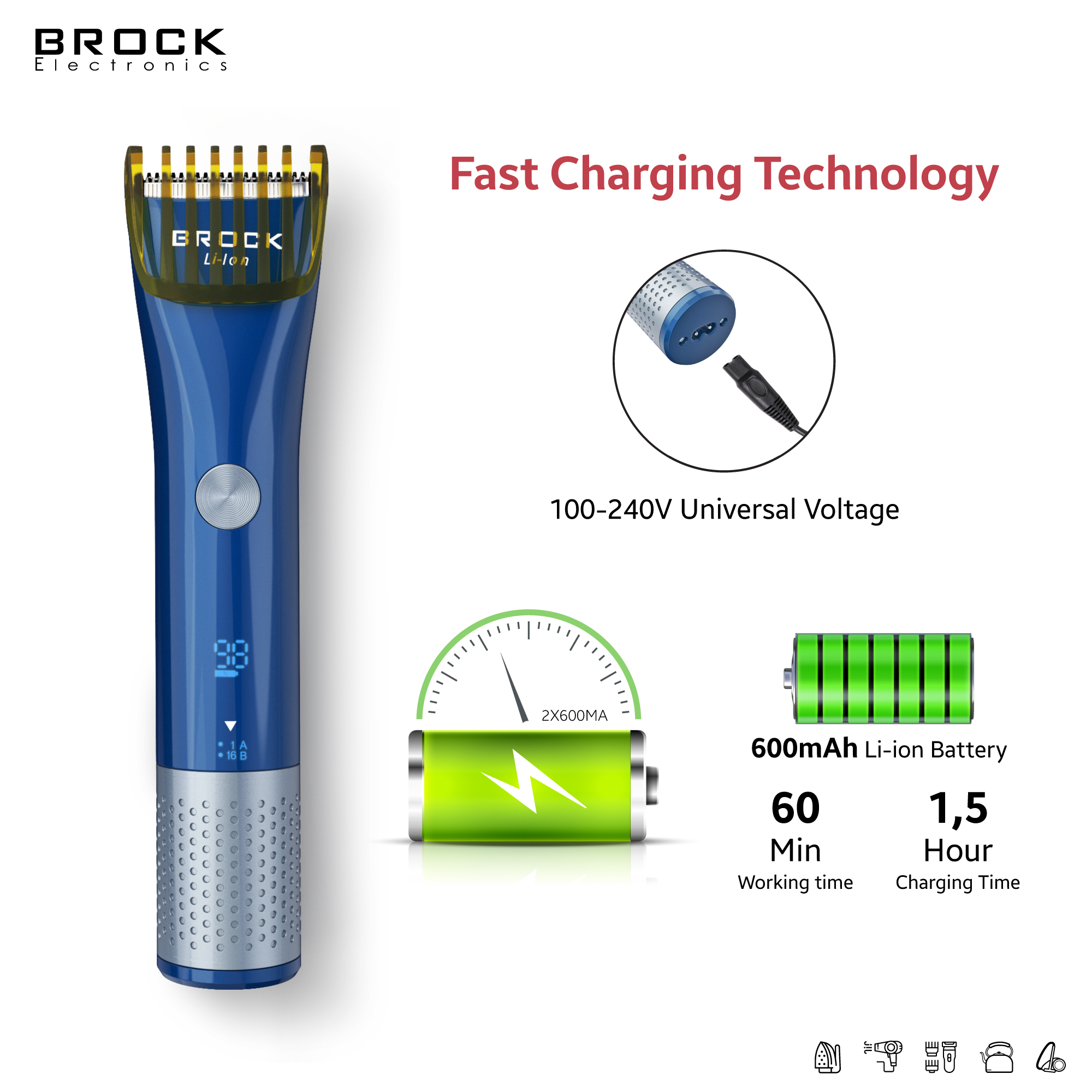 Matu mašīnīte. 1,5 stundas ātrā uzlāde. 60 minūšu darba laiks ar vienu uzlādi. Integrēts litija jonu akumulators 600 mAh. LED displejs ar darba un zema akumulatora uzlādes indikatoru. Regulējamā griešanas ķemme ir piemērota dažāda garuma matu griešanai. 2 griešanas ķemmes: 1-15,5 mm un 16-30,5 mm. IPX6 ūdensizturība. R-veida apaļā galviņa novērš ādas bojājumus. ABS nerūsējošais tērauds. Jauda: 1A/3W, 100-240 V 50/60 Hz.