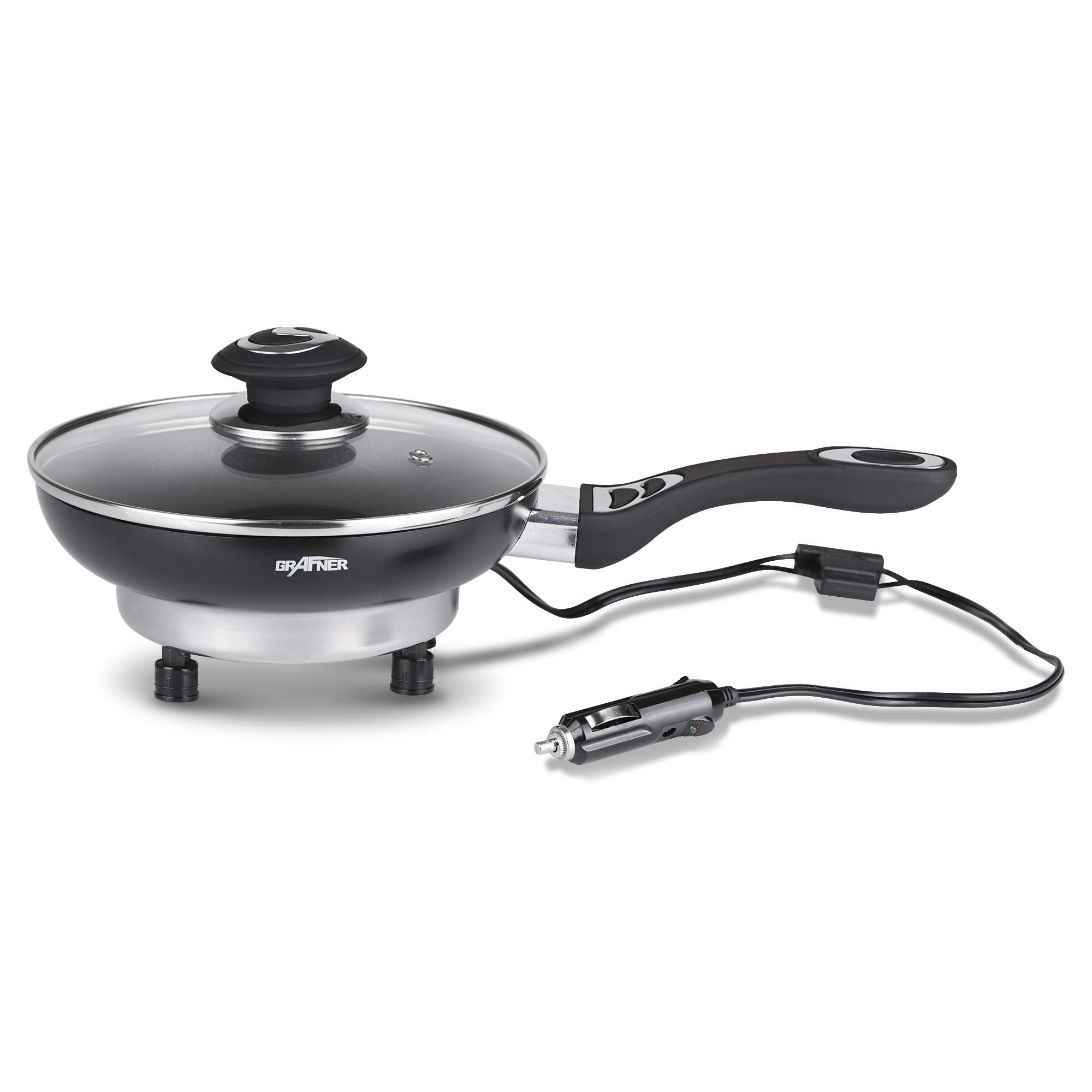 Grafner mobilā panna, alumīnija, ar nelīpošu virsmu, 12 V, 150 W. Krāsa: melna. Tilpums: aptuveni 1,2 litri. Jauda: 150 W. Spriegums: 12 V. Kabeļa garums: 140 cm. Materiāls: alumīnijs un stikls. Kopējie izmēri: aptuveni 36 x 20 x 4 cm. Pannas izmēri: Ø 20 x H 4 cm. Komplektā: panna, 4x neslīdošas kājas, stikla vāks, adapteris, kabelis.