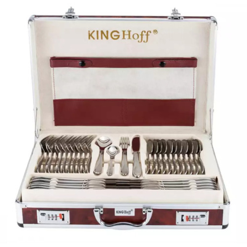 Galda piederumi čemodānā, 72 gabali, satīna Kinghoff. Elegants čemodāns ar augstas klases 72 piederumu komplektu, kas paredzēts 12 personām un izgatavots no augstākās kvalitātes nerūsējošā tērauda. Īpašības: Eleganti augstas kvalitātes galda piederumi, kas izgatavoti no nerūsējošā tērauda hroma-niķeļa 18/10. Iepakots alumīnija futrālī ar koka imitāciju. Augsta izgatavošanas kvalitāte garantē ilgstošu lietošanu. Pats galda piederums ir pietiekami masīvs, neizliekas, izgatavots no ļoti labas kvalitātes hroma-niķeļa sakausējuma ar proporcijām 18/10. Galda piederumi ir īpaši populāri kā ekskluzīva kāzu dāvana. Korpuss sastāv no 2 plauktiem. Galda piederumi ievietoti polsterējumā, kas pasargā tos no skrāpējumiem. Katrā komplektā ietilpst: galda naži 12 gab. galda dakšiņas 12 gab. ēdamkarotes 12 gab. tējkarotes 12 gab. kūku dakšiņas 12 gab. barošanas karotes 2 gab. gaļas dakšiņas 2 gab. Vāzes karote 1 gab. cukurniedres 1 gab. tējkarote cukuram 1 gab. salātu karote 1 gab. salātu dakša 1 gab. kūkas lāpstiņa 1 gab. karote krēmam 1 gab. karote mērcei 1 gab.