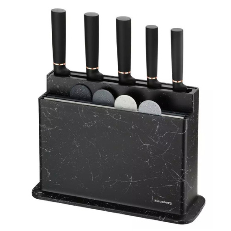 Nažu un griešanas dēļu komplekts, marmora melnā un pelēkā krāsā, Klausberg. Komplektā 5 nažu gabali no augstas kvalitātes nerūsējošā tērauda asmeņiem un 4 griešanas dēļu gabali no augstas kvalitātes drošas plastmasas. 5 nažu komplekts: 8cal - šefpavāra nazis, 8cal - griešanas nazis, 8cal - maizes nazis, 5cal - universāls nazis, 3,5cal - mizošanas nazis. 4 plastmasas griešanas dēļu gabali. Viegli identificēt, viegli uzglabāt.