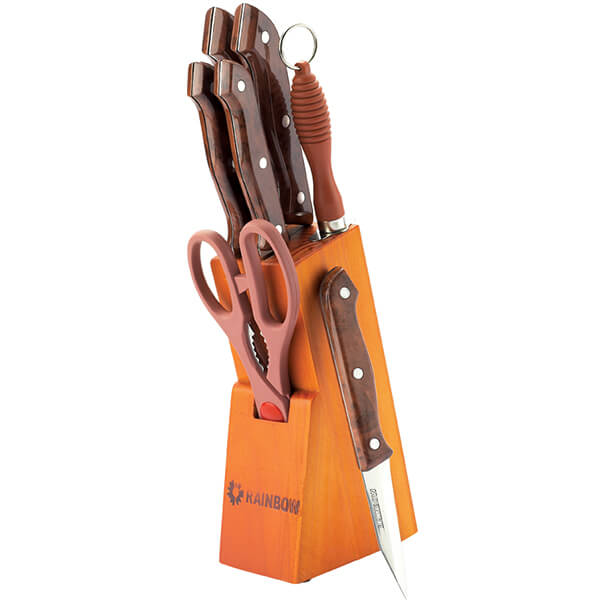 Komplektā 8 piederumi: nažu turētājs, šefpavāra nazis, atkaulošanas nazis, universālais nazis, maizes nazis, dārzeņu nazis un virtuves šķēres, asinātājs