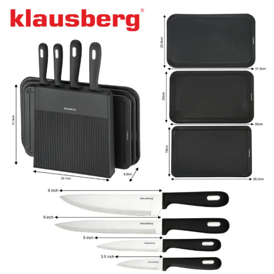 8 daļu nažu un griešanas dēļu komplekts ar organizatoru, melns, nerūsējošais tērauds, Klausberg, KB 7980. 8 vienā komplekts – 4 naži, 3 dēļi un organizators vienā komplektā. Nerūsējošā tērauda asmeņi – izturīgi, asi, izturīgi pret koroziju. 3 dažādu izmēru dēļi – atsevišķi gaļai, dārzeņiem un maizei. Neslīdoša virsma – droša un stabila griešana. Ventilējams statīvs – higiēniska uzglabāšana un ātra žūšana. Ergonomiski rokturi – drošs un ērts satvēriens. Dēļi nepadara nažus trulus – īpašā struktūra aizsargā asmeņus. Augsta funkcionalitāte un izturība ikdienas lietošanā. Komplektā ietilpst (8 daļas): naži – šefpavāra nazis 8", 8" maizes nazis (ar zobiem), universālais nazis 5", dārzeņu nazis / mizotājs 3.5", dēļi – 31.8 × 20.8 cm, 30 × 20 cm, 28.2 × 19 cm, 2-in-1 statīvs/organizators. Tehniskie dati: elementu skaits: 8 (4 naži + 3 dēļi + statīvs), asmeņi: nerūsējošais tērauds, rokturi: ergonomiski, melni, dēļu materiāls: plastmasa, neslīdoša struktūra, krāsa: melna / tērauds, pielietojums: mājai, sabiedriskajai ēdināšanai, dāvanai, statīva izmēri: augstums 21.3 cm, platums 20.1 cm, dziļums 9.2 cm.