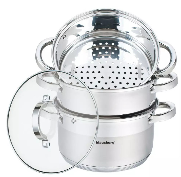 Tvaika katls, tērauds, komplektā 4 gab Ø20cm, 3.1L, Klausberg. Izgatavots no augstas kvalitātes nerūsējošā tērauda. Siltuma dibens ar siltuma vadītspēju. Ēdiens ātri uzsilst un saglabā siltumu. Pielāgots visām plītīm: elektriskām, gāzes, keramikas un indukcijas. Ļauj veselīgi pagatavot maltītes, t.i., gatavot ar nelielu ūdens daudzumu, kā arī nelielu daudzumu tauku, pateicoties kuriem tas samazina vitamīnu, minerālvielu un garšas zudumu. Praktiskā liešanas mala novērš pilēšanu. Rokturi nesakarst. Viegli tīrāms. Var mazgāt trauku mazgājamā mašīnā. Tilpums: 3,1l, Ø20x10cm.