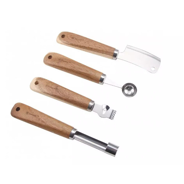 4 elementu komplekts augļiem no nerūsējošā tērauda un akācijas masīvkoka. Komplektā ir: sausspalva āboliem, karote kroketu griešanai, mazais smalcinātājs porciju sadalīšanai, citrusaugļu mizotājs.