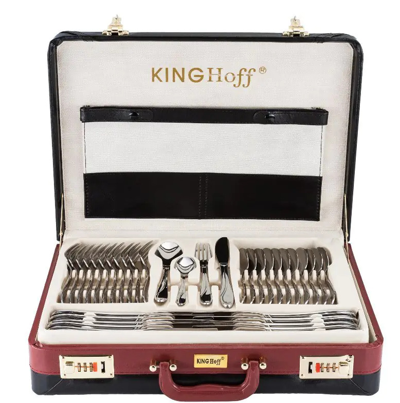 Galda piederumu komplekts, 72 gabali, spīdīgs tērauds Kinghoff. Eleganti augstas kvalitātes galda piederumi no 18/10 nerūsējošā hroma-niķeļa tērauda. Iepakots alumīnija futrālī ar koka imitāciju. Augsta izgatavošanas kvalitāte garantē ilgstošu lietošanu. Uzņēmuma galda piederumi nesaskrāpē, laika gaitā netumst, tos var lietot trauku mazgājamajā mašīnā, nepakļaujot sevi krāsas izmaiņām. Pats galda piederums ir pietiekami masīvs, izgatavots no ļoti labas kvalitātes hroma-niķeļa nerūsējošā tērauda. Ieteicams kā eleganta dāvana.