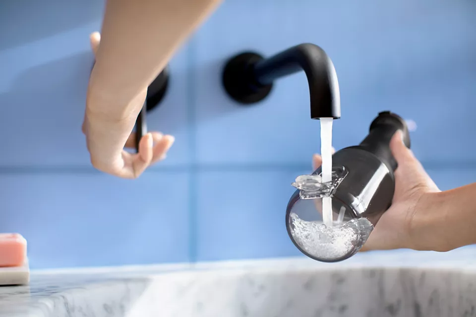 250 ml tvertnē ir pietiekami daudz ūdens ieteicamajai 60 sekunžu tīrīšanai. Vienkārši pagrieziet un noņemiet vai izmantojiet sānu uzpildes atveri, lai to viegli uzpildītu.