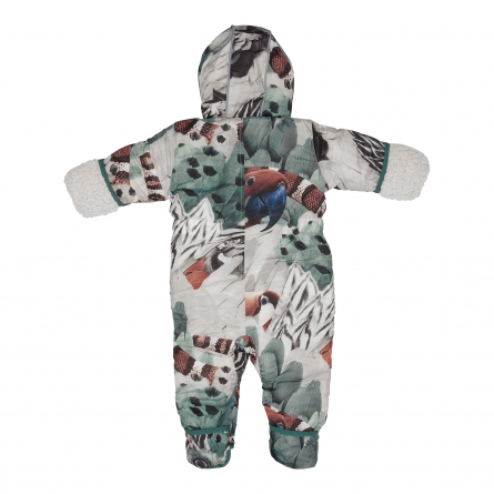 Kombinezonam ir rāvējslēdzējs no kakla daļas līdz kreisajai pēdai, kas padara vieglu un ērtu tā uzvilkšanu. Pateicoties elastīgajai joslai, kapuce aiztur vēju un perfekti pieguļ bērna galvai. Mazuļu ziemas kombinezons pieejams ar skaistiem moderniem rakstiem,  kurus var kombinēt ar Lodger ziemas apģērbu aksesuāriem: cepurēm, cimdiem, šallēm, zābaciņiem.