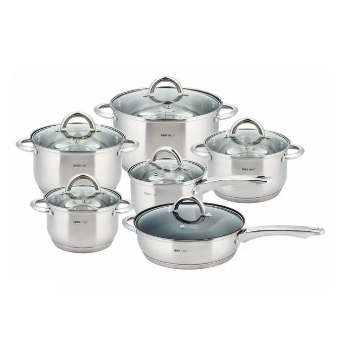 Katlu komplekts 12 gab., tērauds, Kinghoff. Izgatavots no augstas kvalitātes nerūsējošā tērauda. Daudzslāņu termo dibens, kas saglabā siltumu. Ēdiens ātri uzsilst un saglabā siltumu ilgu laiku. Praktiskais malu dizains novērš pilēšanu gatavošanas laikā. Karstumizturīgi rokturi. Komplektā: katls ar vāku Ø16 x 10,5 cm 2,1 l- katls ar vāku Ø16 x 10,5 cm 2,1 l- katls ar vāku Ø18 x 11,5 cm 2,9 l- katls ar vāku Ø20 x 12,5 cm l- panna ar pārklājumu Ø24 x 7,5 cm 3,4 l.