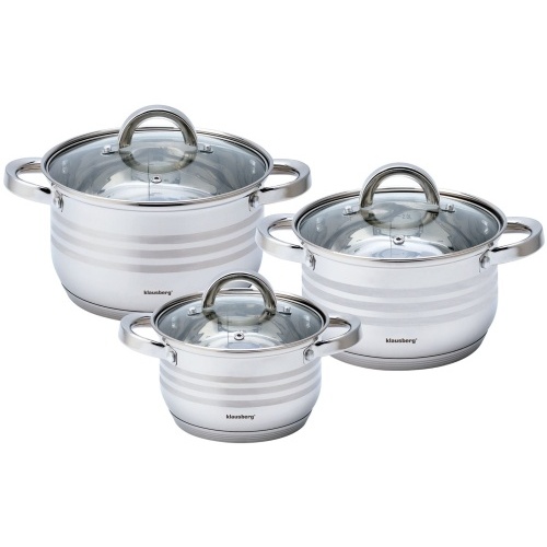 Trauku komplekts, Ø16/18/20cm Klausberg. Izgatavots no augstas kvalitātes nerūsējošā tērauda. Daudzslāņu termo dibens, kas saglabā siltumu. Ēdiens ātri uzsilst un ilgstoši saglabājas silts. Karstumizturīgi rokturi. Viegli mazgājams. Drošs automātiskajās trauku mazgājamajās mašīnās.