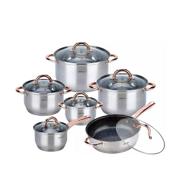 Katlu komplekts, 12 gab., rozā zelta krāsā KINGHoff. Izgatavots no augstas kvalitātes nerūsējošā tērauda. Daudzslāņu termodibens saglabā siltumu. Ēdiens ātri uzsilst un ilgstoši saglabājas silts. Piemērots visu veidu apkures avotiem: gāzes, elektriskajiem, keramikas, stikla, halogēna un indukcijas degļiem. Karstumizturīgi rokturi. Viegli mazgājams. Var mazgāt trauku mazgājamā mašīnā. Komplektā: kastrolis ar vāku Ø16 x 10,5 cm 2,1 l, katls ar vāku Ø16 x 10,5 cm 2,1 l, katls ar vāku Ø18 x 11,5 cm 2,9 l, katls ar vāku Ø20 x 12,5 cm 3 ar 4 x 9,5 cm. 14,5 cm 6,6 l, panna ar vāku Ø24 x 7,5 cm 3,4 l.