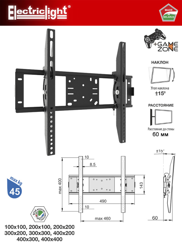VESA montēšanas standarts: 100x100; 200x100; 200x200; 300x200; 300x300; 400x200; 400x300; 400x400