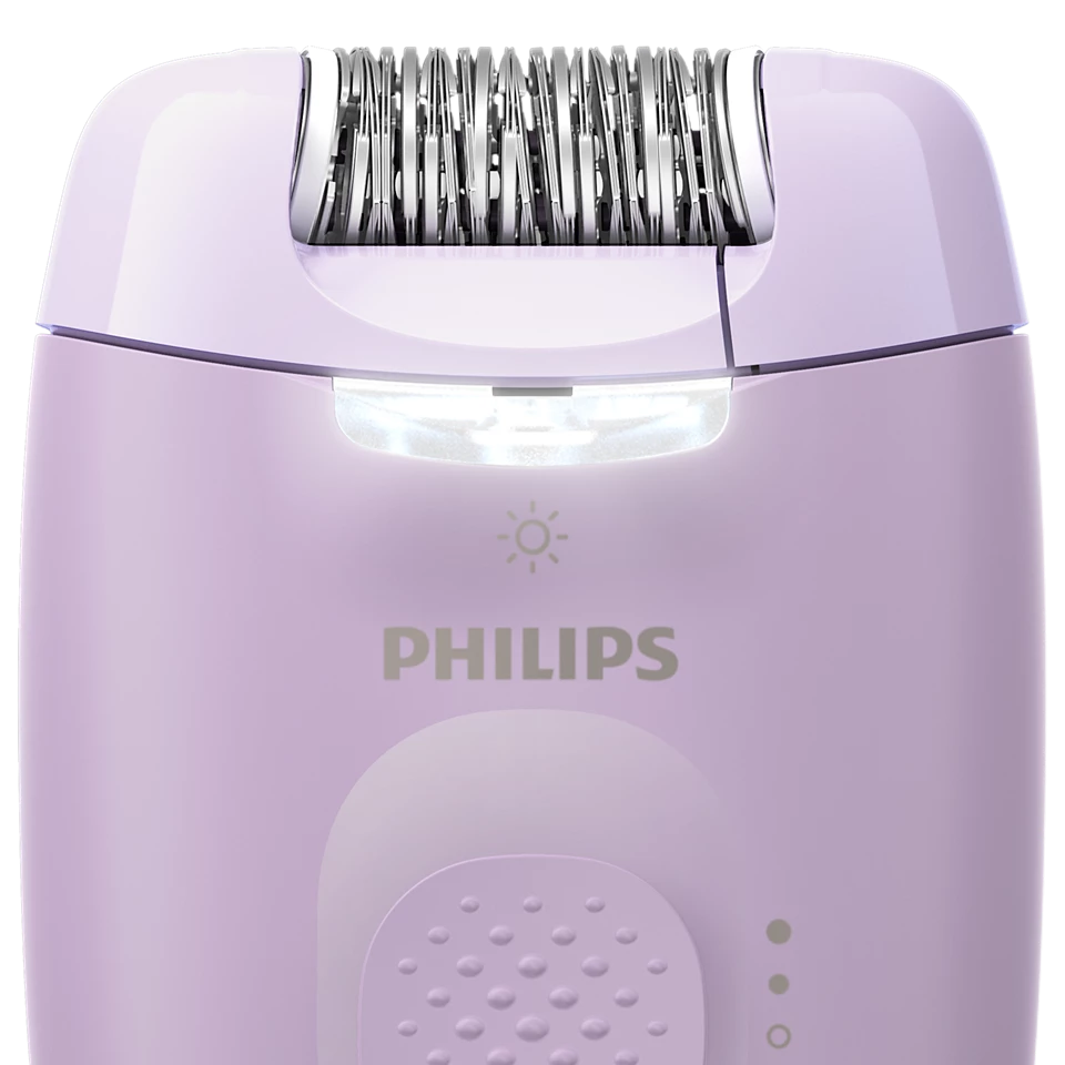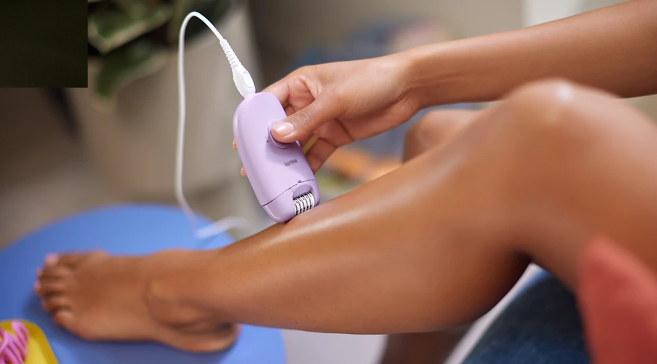 Sākums ceļam uz gludu ādu. Iepriekš ar ķemmi apgrieziet garākos matiņus, lai saudzētu ādu. Epilējiet izvēlētās zonas un uzlieciet masāžas uzgali, lai mazinātu epilācijas radītās sajūtas. Ar skuvekļa uzgali pielāgojiet rezultātu, un, kad tas paveikts, ielieciet epilatoru maciņā.