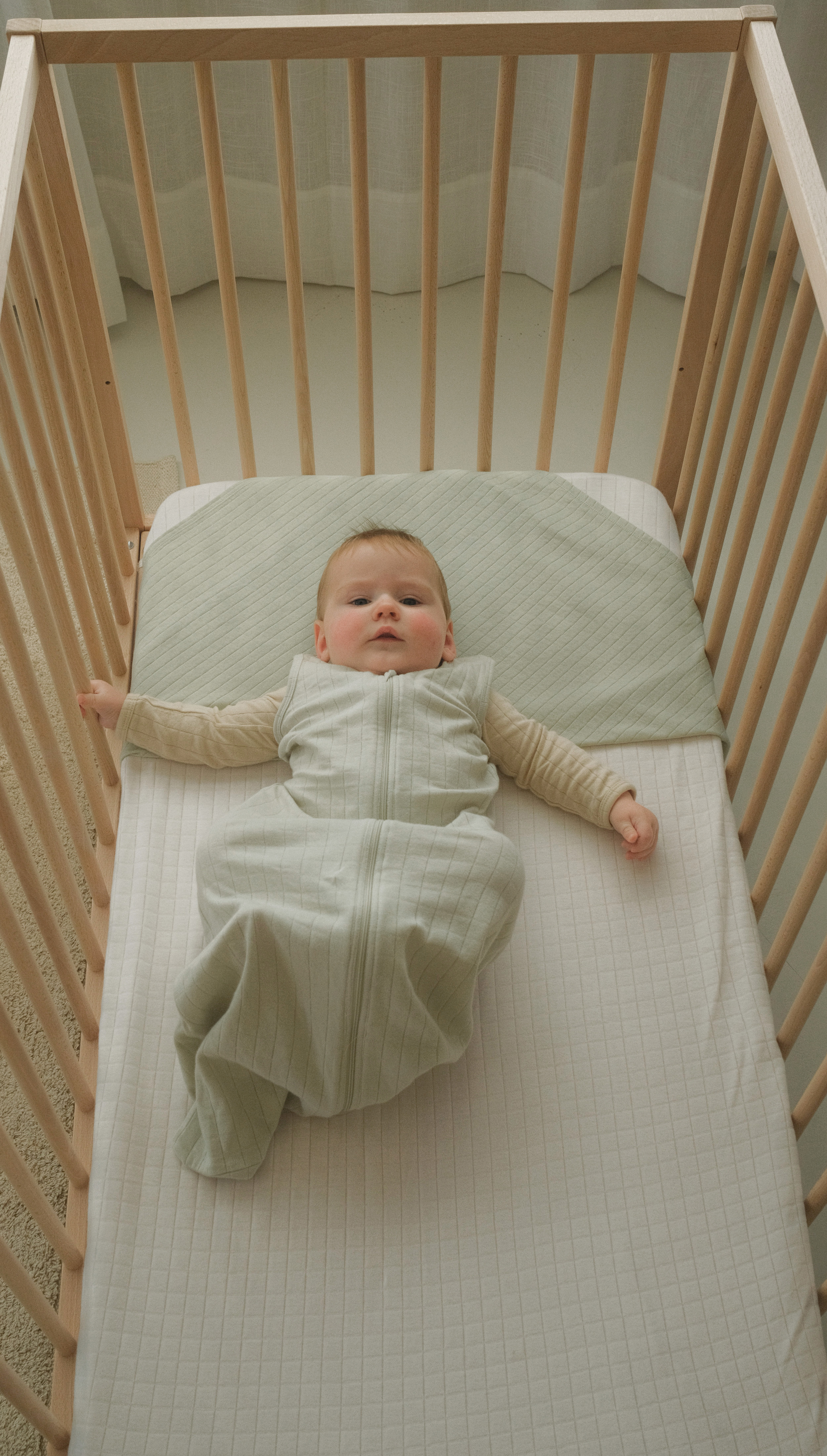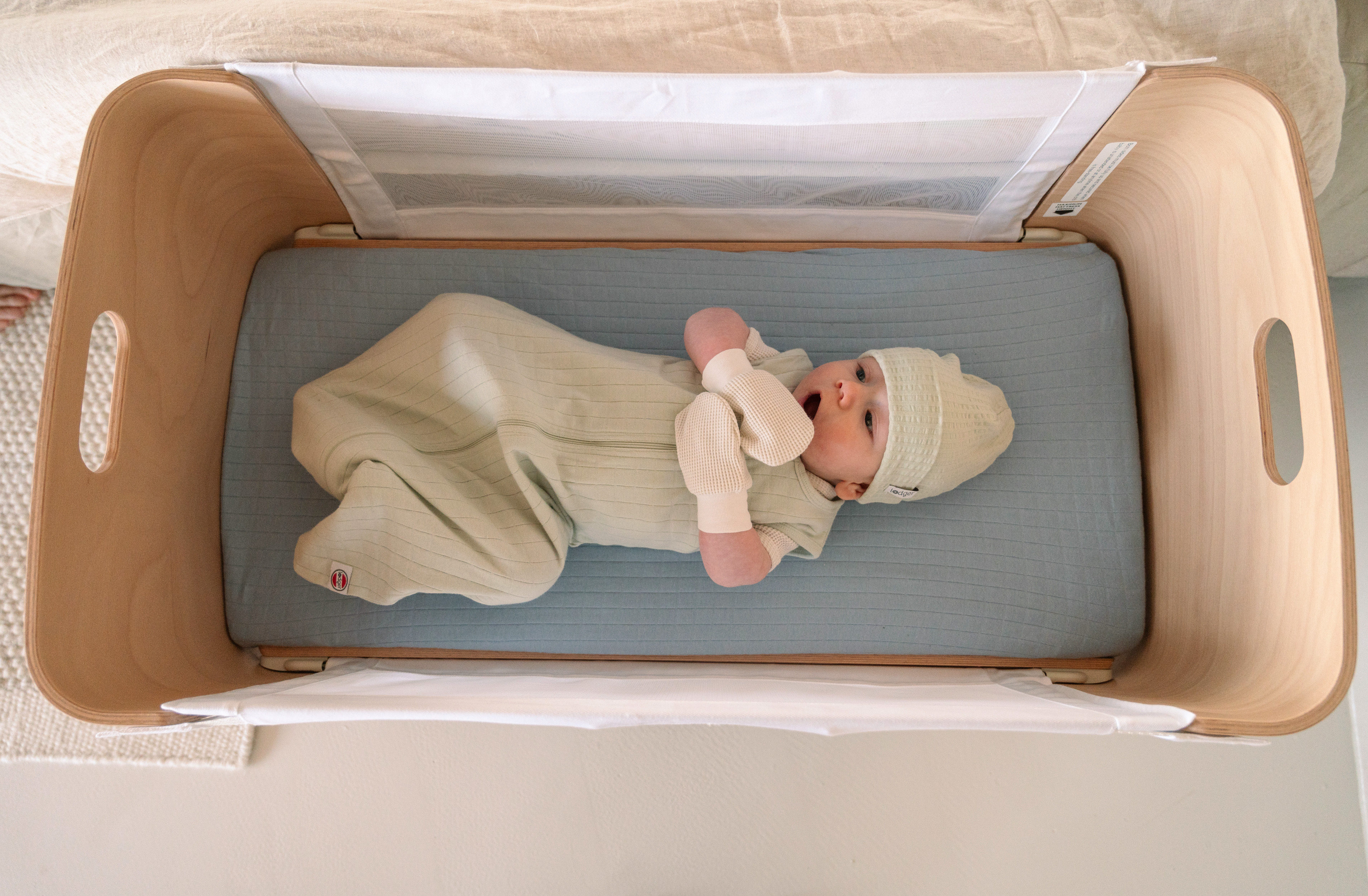 Elpojošs oragniskās kokvilnas guļammaiss. Tajā ir pietiekami daudz vietas, lai varētu kustināt kājas, bet tajā pašā laikā juties droši. Tāpat guļammaisam ir rāvējslēdzējs, kas atveras līdz pat apakšai, lai atvieglotu autiņbiksīšu nomaiņu.