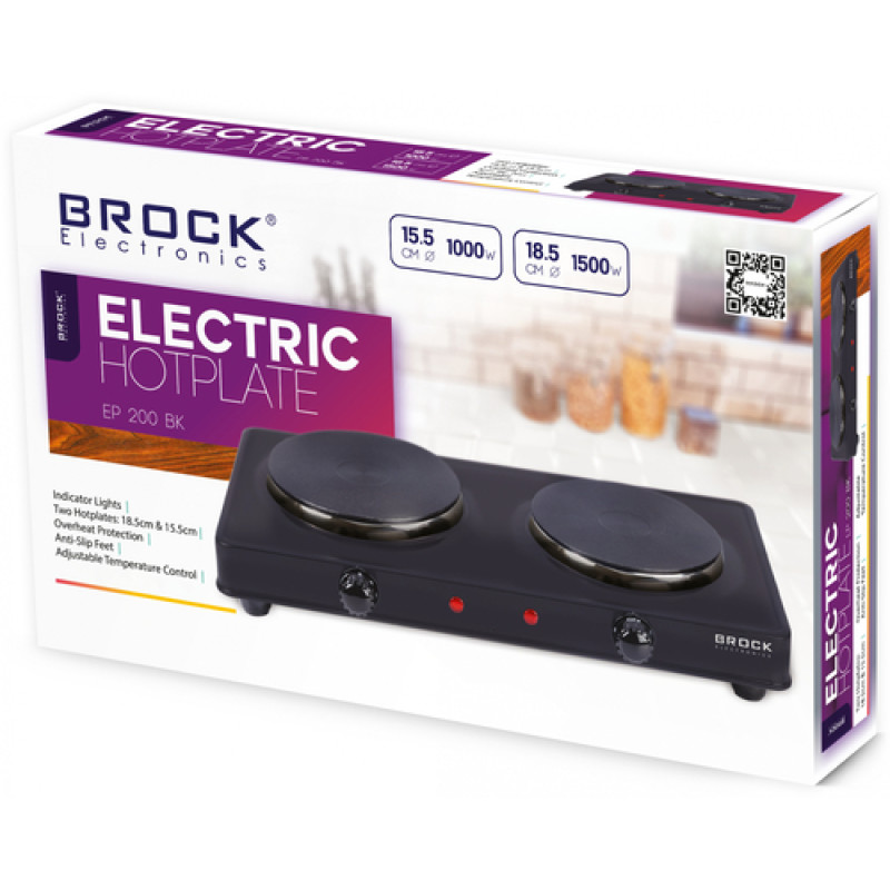 2 sildvirsmas ar 18.5 un 15.5 cm diametru Automātiskais termostats Gaismas indikators Pārkaršanas aizsardzības sistēma Neslīdošā pamatne Jauda 1000 + 1500W Attālums starp sildrinķiem 4.9cm 220-240 V, 50-60 Hz