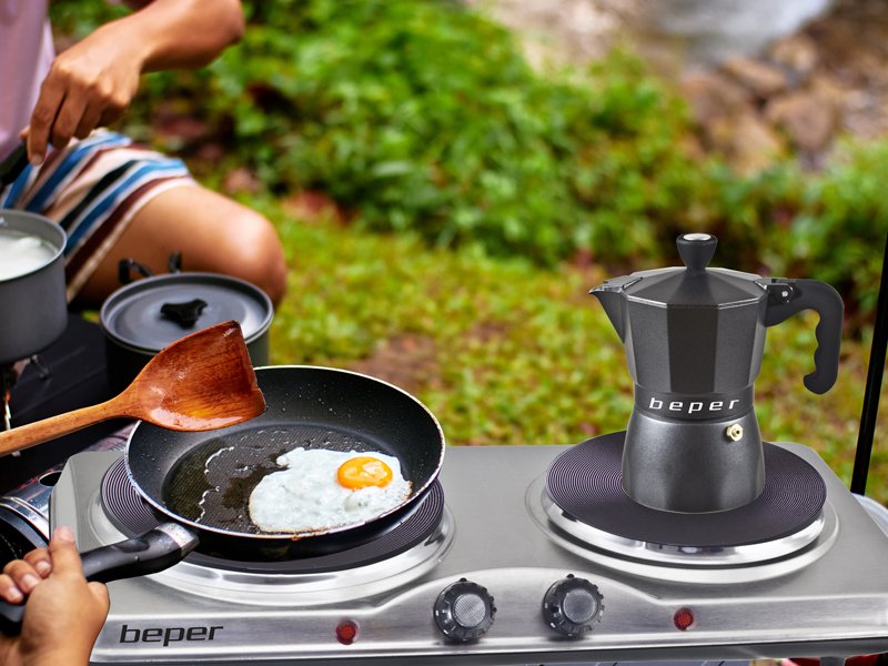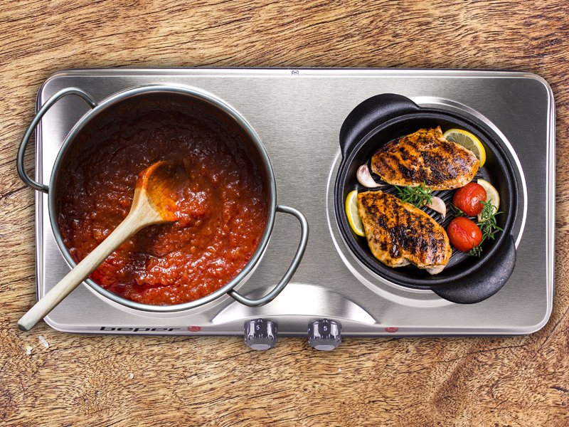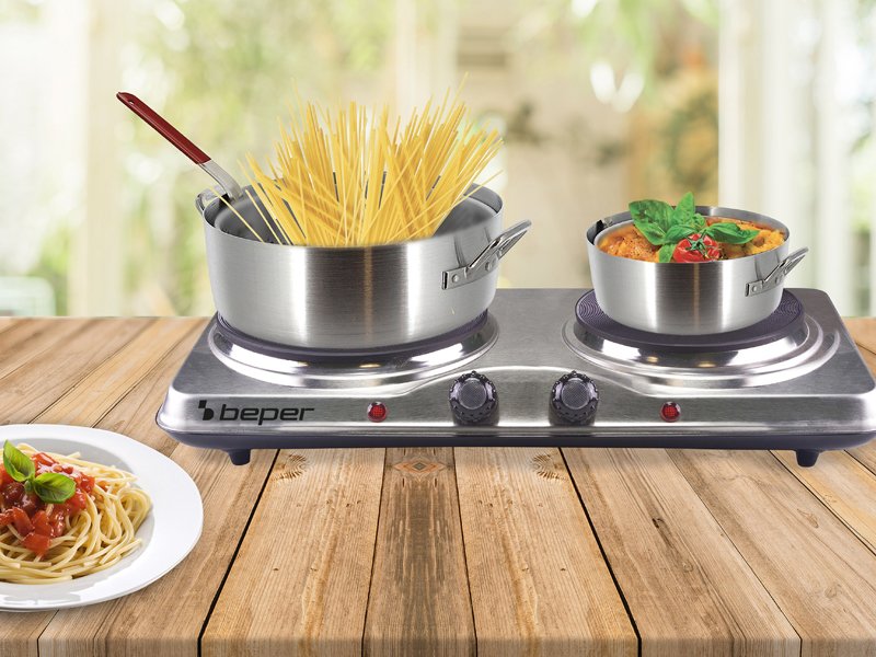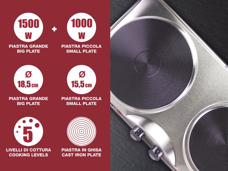 Elektriskā plītiņa ar tērauda korpusu un 2 čuguna plāksnēm, ar diametru 18,5cm un 15,5cm.