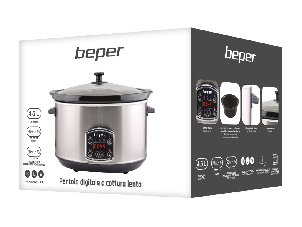 Digitālais lēnās vārīšanas katls ar nerūsējošā tērauda korpusu, stikla vāku un 4,5 l keramikas trauku. Lēna un pastāvīga gatavošana saglabā ēdiena dabisko garšu. Digitālais displejs ar barošanas pogu, taimeri no 30 minūtēm līdz 16 stundām un pogu gatavošanas sākuma laika iestatīšanai. 3 izvēles iestatījumi: augsts, zems, uzturēt siltumu. Vēsa pieskāriena rokturi, trauku mazgājamajā mašīnā mazgājama tvertne un vāks. Neslīdošas kājiņas.
