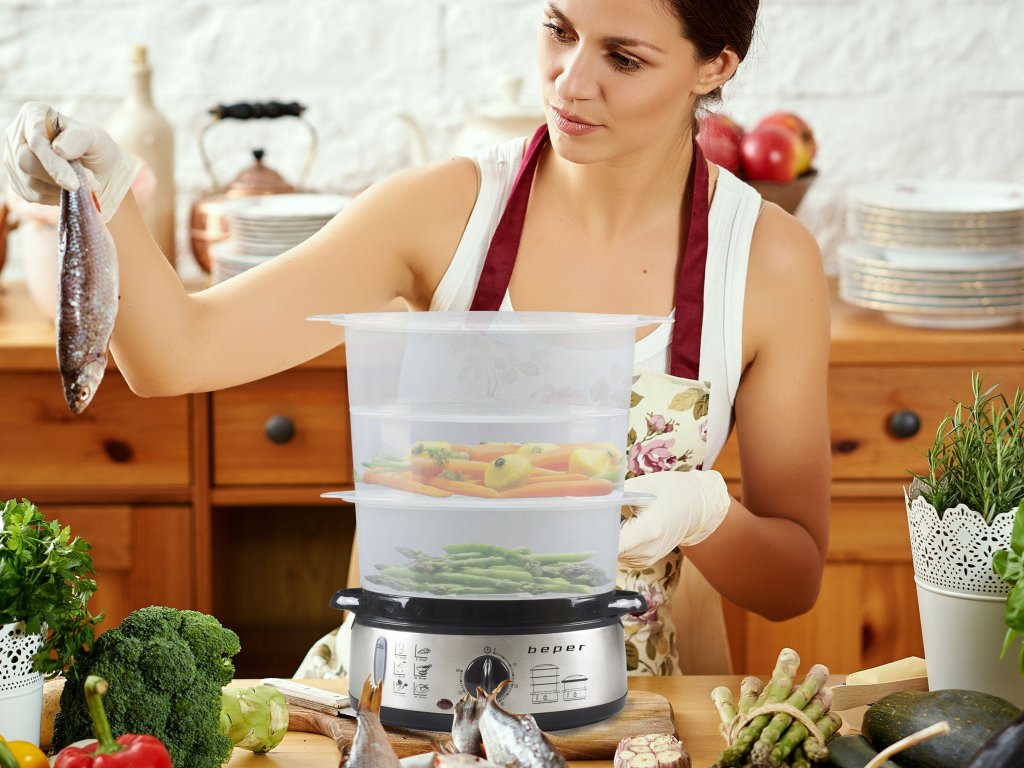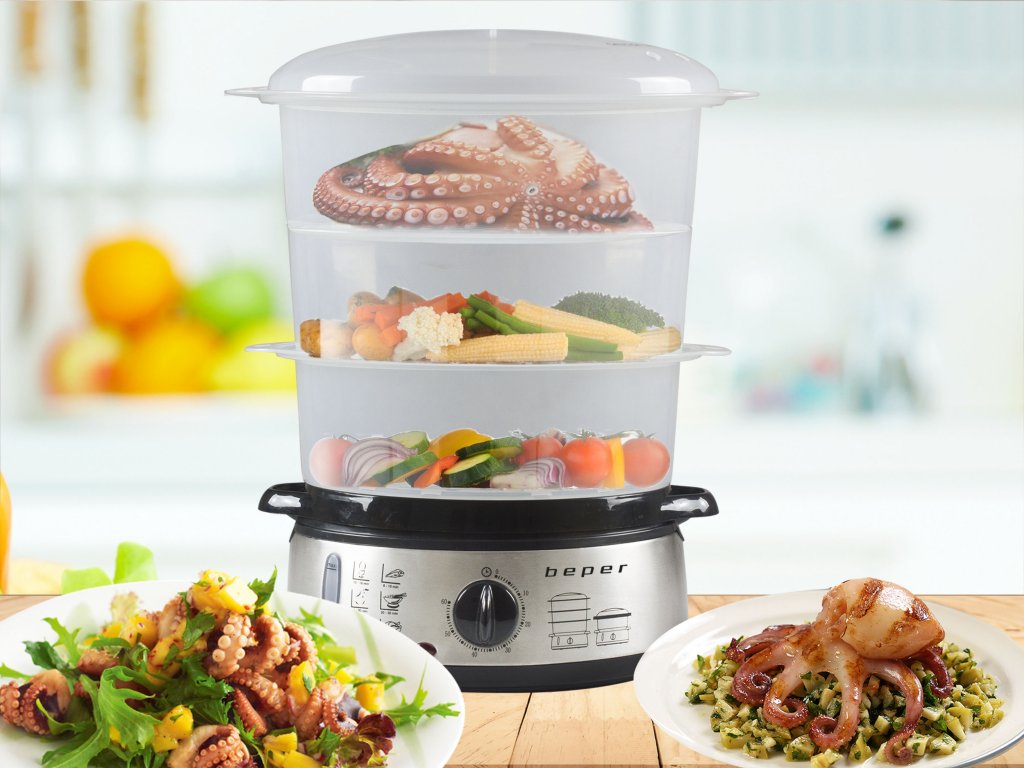 Tvaicētājs ar tērauda konstrukciju un 3 bļodām no caurspīdīgas BPA nesaturošas plastmasas ar kopējo ietilpību 9L. 1L tvertne ar ūdens līmeņa indikatoru un iespēju papildināt pat gatavošanas laikā. Šķidruma savākšanas paplāte ar rokturiem. Darbības gaisma un poga ar 60 minūšu taimeri. Automātiska izslēgšanās, kad beidzas ūdens. Komplektā iekļauts rīsu vārīšanas trauks. Viegli tīrāms un glabājams, pateicoties vietu taupošajām bļodām.