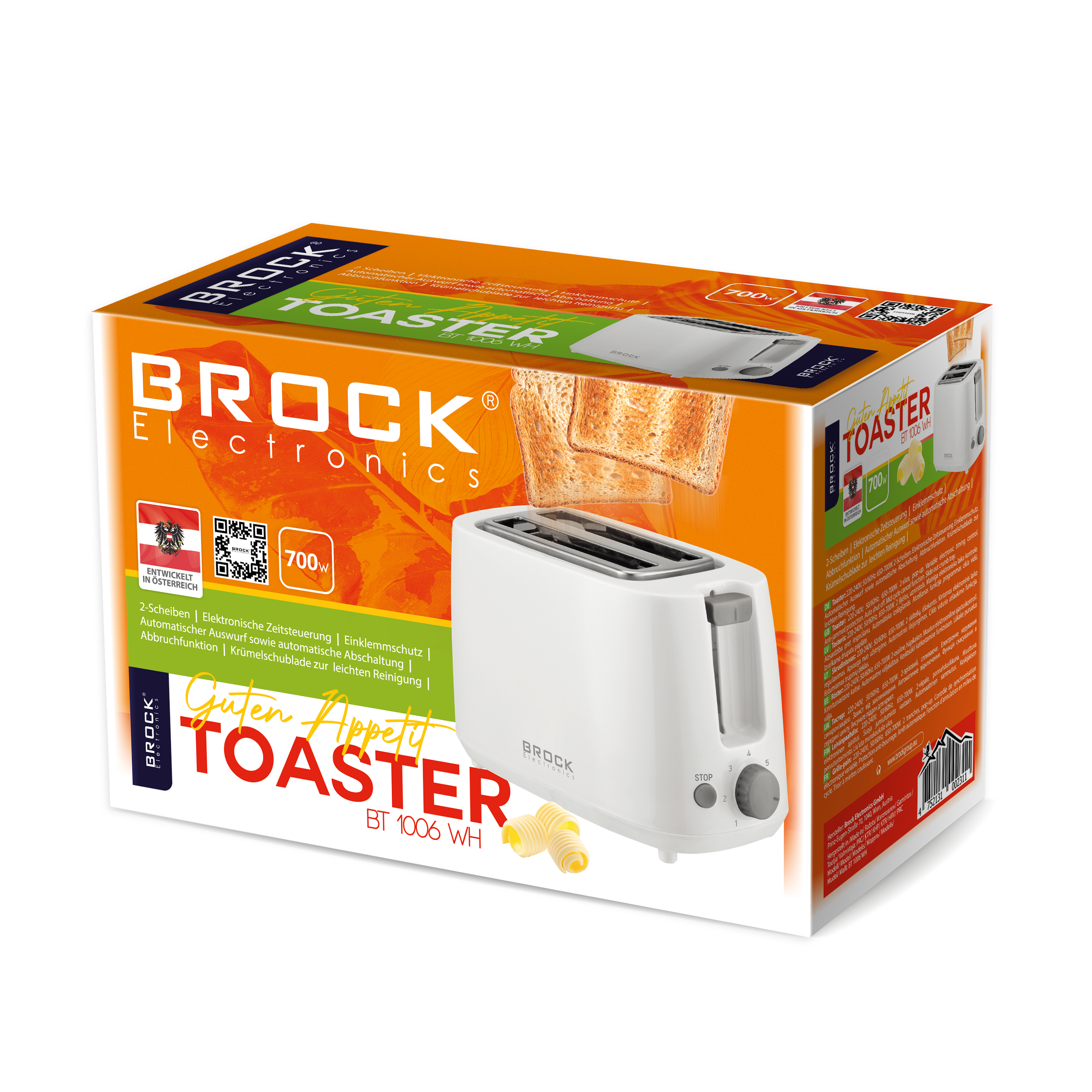 Tosteris, 220-240V; 50/60Hz, 650-700W. 2 šķēles, uznirstošs. Mainīga elektroniska laika kontrole. Aizsardzība pret iesprūšanu. Automātiska izslēgšanās. Atcelšanas funkcija programmas cikla vidū. Izvelkama drupatu paplāte.