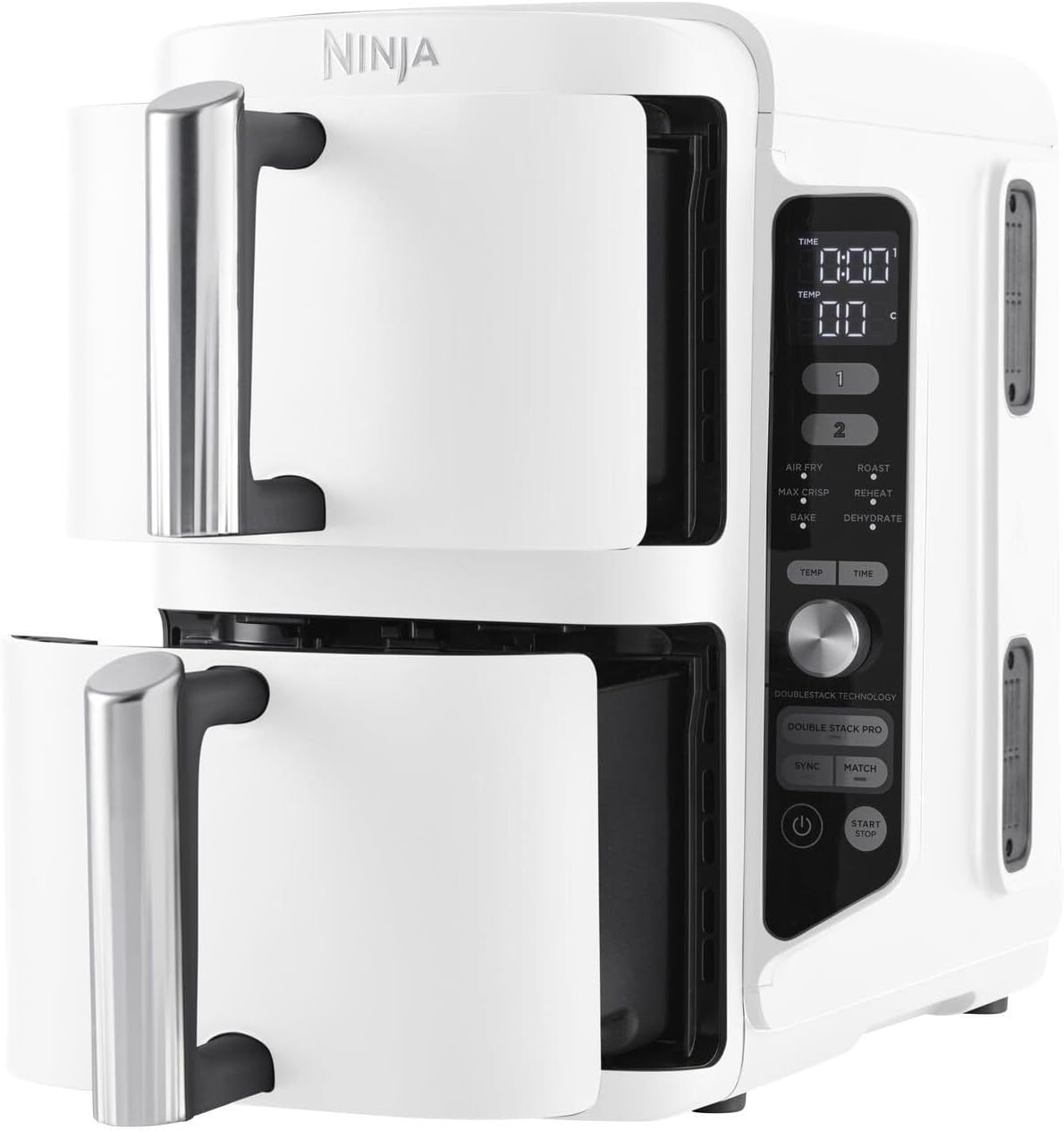 Vai vēlaties savā virtuvē ietilpināt dubulto karstā gaisa friteri, taču vieta ir ierobežota? Iepazīstinām ar Ninja Double Stack XL 2 atvilktņu karstā gaisa friteri. Šim dubultajam karstā gaisa friterim ir divas atvilktnes, kas novietotas viena virs otras, aizņemot mazāk vietas, nekā tas ir parasto divu atvilktņu karstā gaisa friteru gadījumā, kad atvilktnes ir novietotas blakus viena otrai. Tagad divās individuāli regulējamās atvilktnēs varat apvienot 6 gatavošanas funkcijas, gatavošanas laikus un temperatūras, un visi ēdieni būs gatavi pasniegšanai vienlaicīgi. Un tas viss – pat nelielās virtuves telpās!