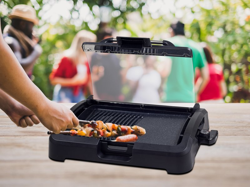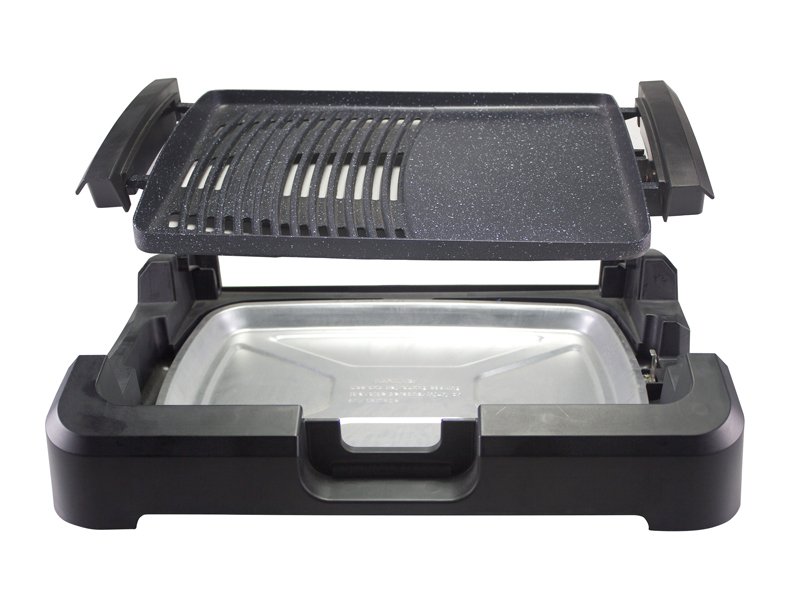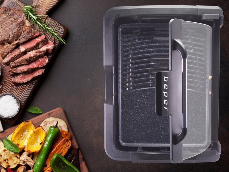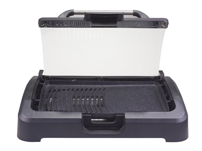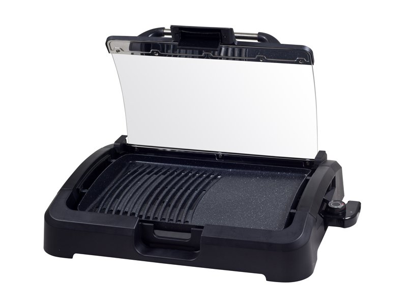Elektriskais bārbekjū ar atbalsta korpusu no izturīgas plastmasas un zem spiediena lieta alumīnija plāksne ar nepiedegošu pārklājumu 39x29cm ar siltumizolējošiem rokturiem. Aprīkots ar stikla vāku ar tērauda rokturi, lai ēdiens būtu silts un izvairītos no izšļakstīšanās gatavošanas laikā. Komplektā alumīnija ūdens paplāte gatavošanai bez dūmiem. Termostats ar 5 izvēles temperatūras līmeņiem. Ļoti vienkārša tīrīšana, pateicoties pilnībā noņemamām sastāvdaļām.