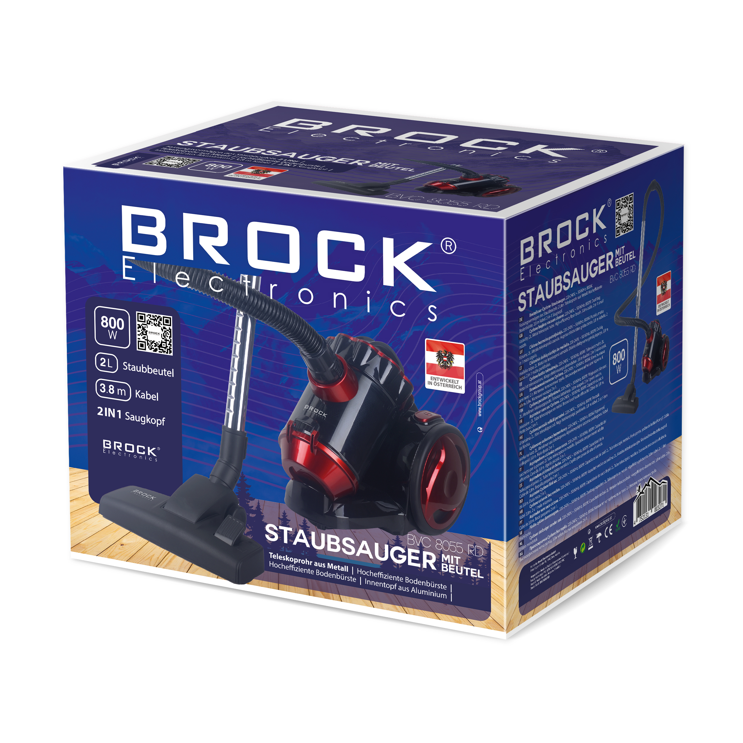 Ciklona bezmaisu putekļsūcējs, 220-240V, ~ 50/60Hz, 800W. Putekļu maisa tilpums: 2L. Metāla teleskopiskā caurule. Augstas efektivitātes grīdas birste. 3,8 m kabelis. 2 vienā mazā sprausla. 180 W sūkšanas jauda, 17 kpa vakuums, 1,3 m3 / s gaisa plūsma, 78 dbA trokšņa līmenis