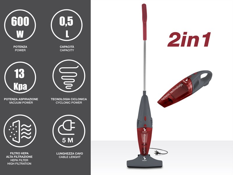 Praktiska un viegla elektriskā slota ar 500 ml tvertnes ietilpību. Noņemams alumīnija rokturis, lai kļūtu par ērtu vada putekļu sūcēju. Viegli iztukšojama tvertne un auduma HEPA filtrs, kas nodrošina trīs filtrēšanas posmus. Ergonomisks rokturis ērtai satveršanai. Aprīkots ar birsti un spraugu uzgali. Vada uzglabāšana.