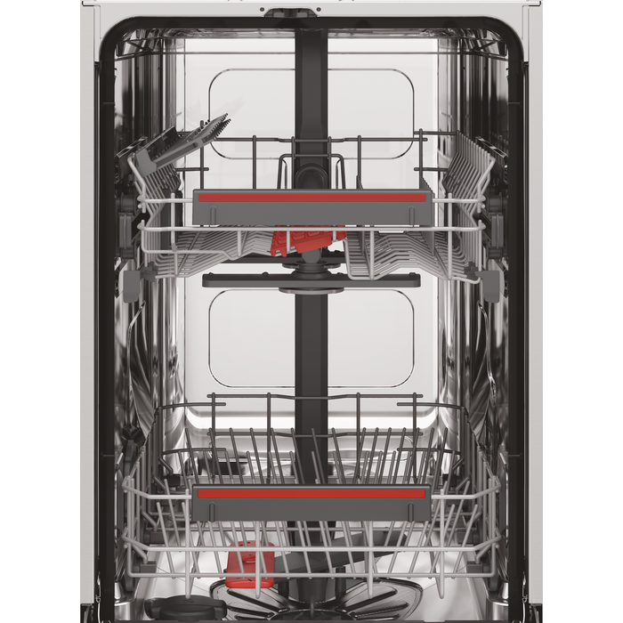 Garantējiet maksimālu ūdens piekļuvi ar diviem izsmidzinātājiem. Rotējošie izsmidzinātāji virza ūdens strūklu katrā augšējā un apakšējā groza stūrī, tādēļ jūs varat paļauties uz trauku mazgāšanas rezultātiem.
